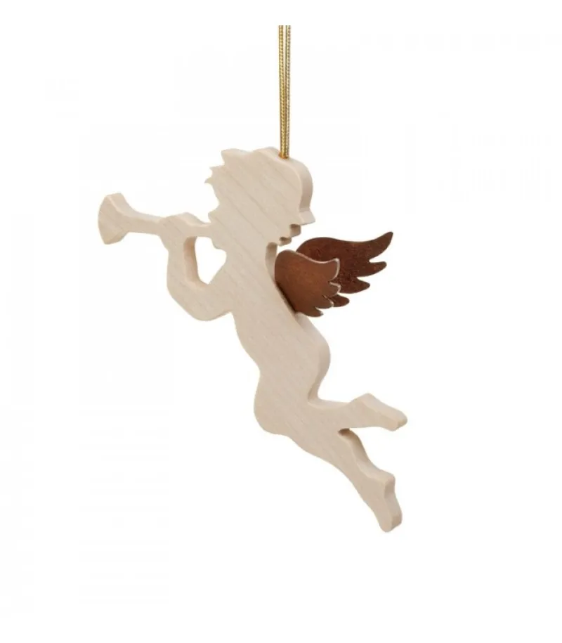 Petit Ange Décoratif A Suspendre, En Bois D’Erable, Jouant De La Trompette Avec Ailes En Metal Oxyde Laque.