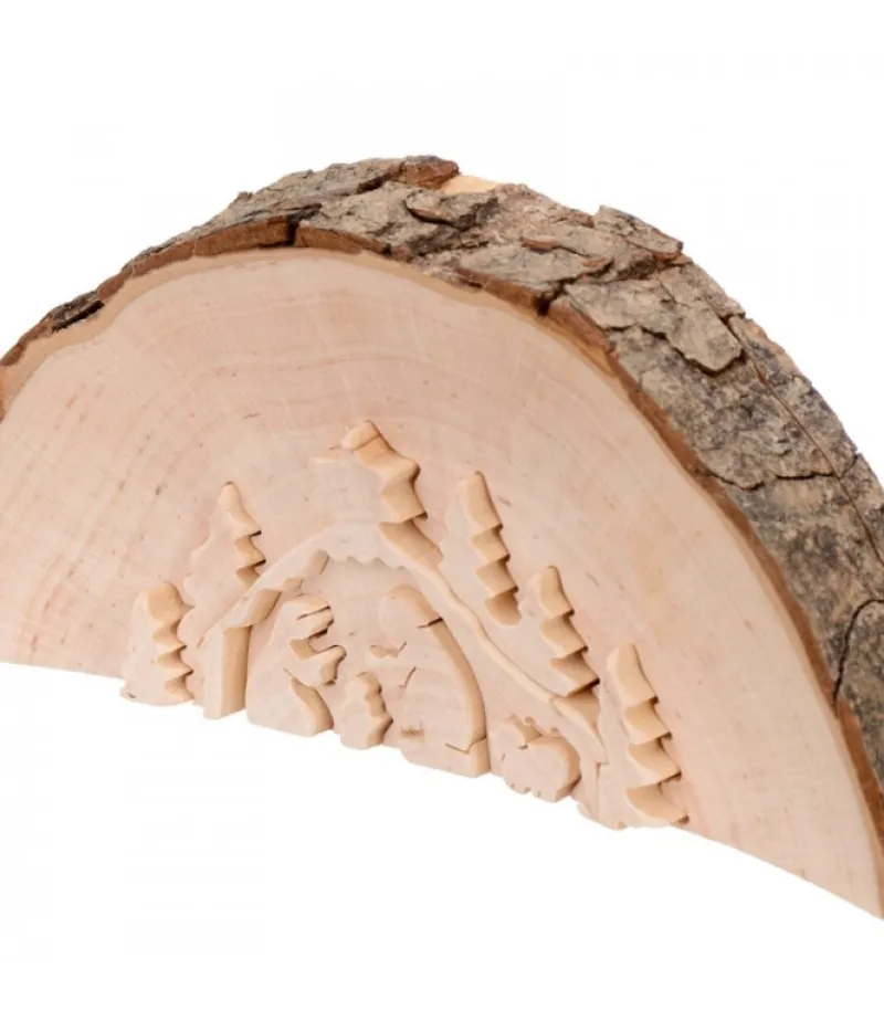 Crèche De Noël En Bois Cisele, Taillee Dans Un Demi Rondin.