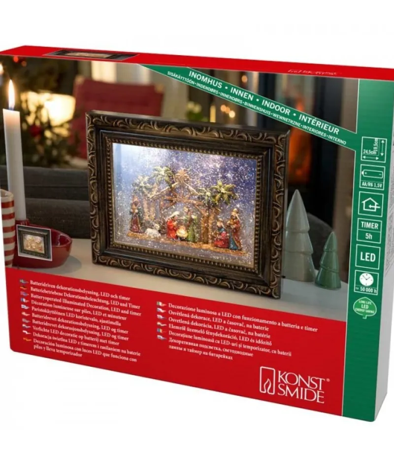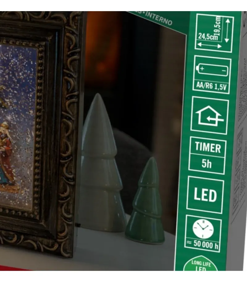 Cadre Lumineux Comportant Une Scene De Crèche De Noël Avec Effet Boule À Neige.
