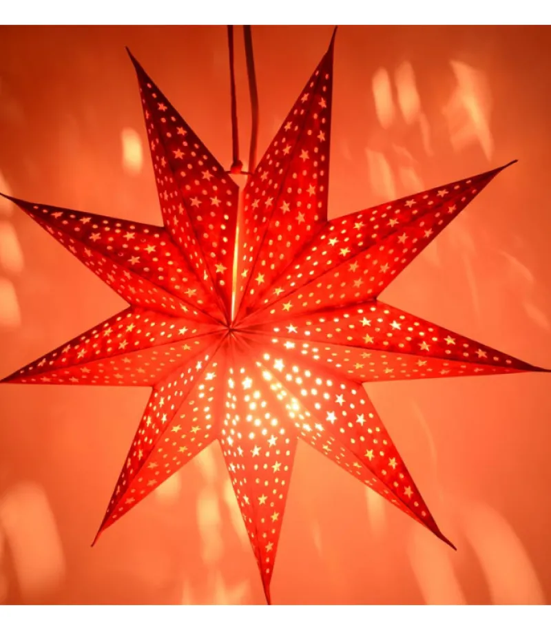 Etoile Lumineuse En Papier A Suspendre, Couleur Rouge, Motif Perfore, 9 Branches.