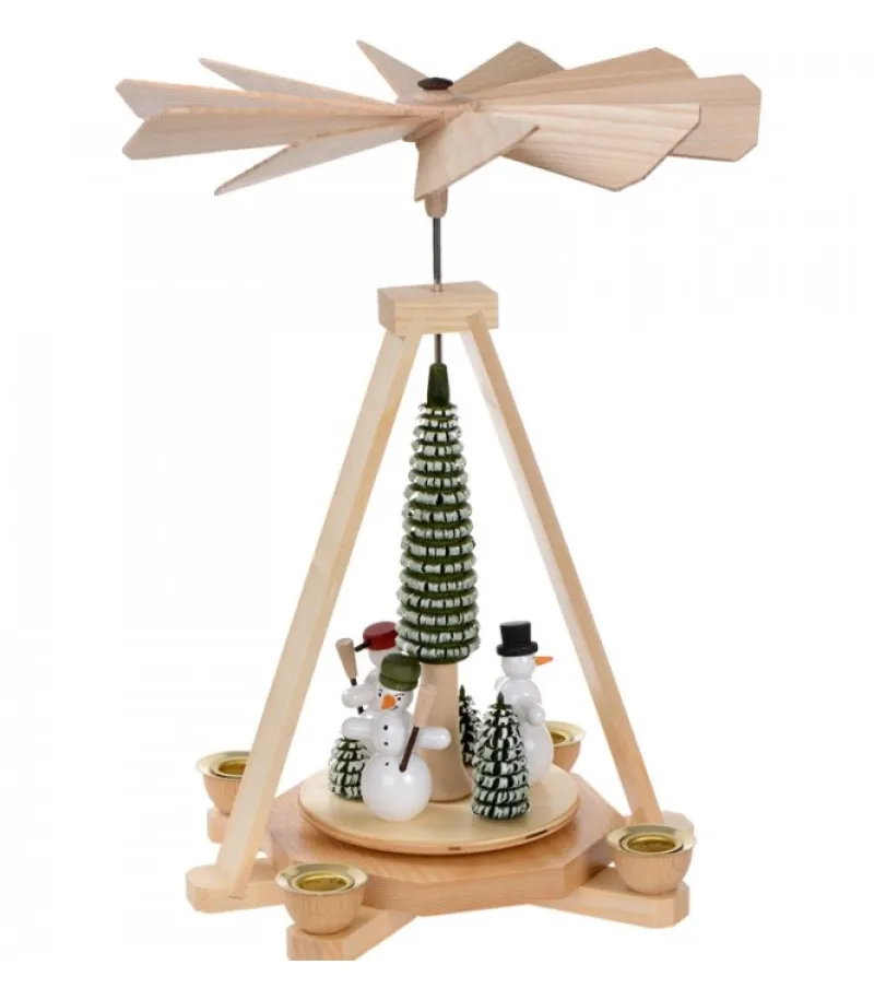 Pyramide A Bougie Avec Bonhommes De Neige Autour D’Un Sapin.