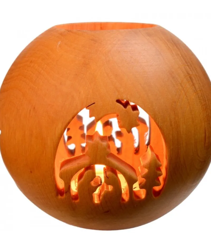 Photophore En Bois Naturel De Forme Ronde Avec Une Crèche De Noël Découpee Et Une Etoile Sur Les 2 Autres Faces.Fonct…