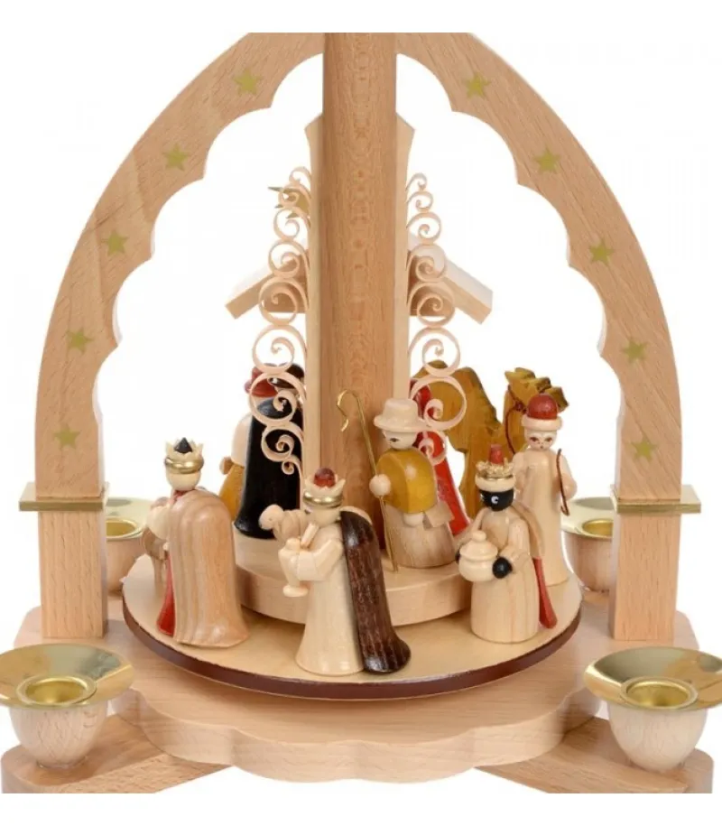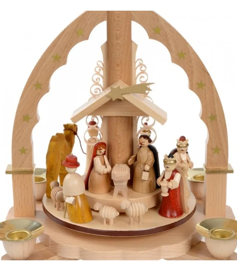 Pyramide En Bois Allemande En Forme D’Arche En Bois Naturel Avec Personnages De La Crèche De Noël Complete.