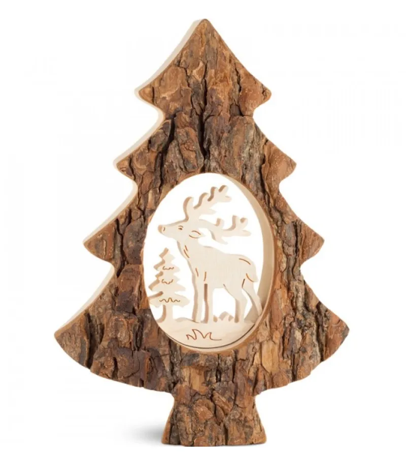 Sapin En Bois Découpe Dans De L’Ecorce De Rondin De Bois.Motif Cisele Cerf Dans La Foret,