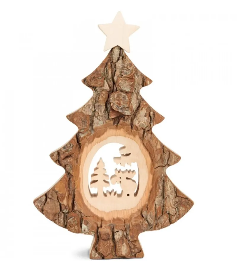 Sapin De Noël En Bois Découpe Dans De L’Ecorce Avec Etoile Sur Le Dessus..Motif Elan Dans La Foret Cisele,