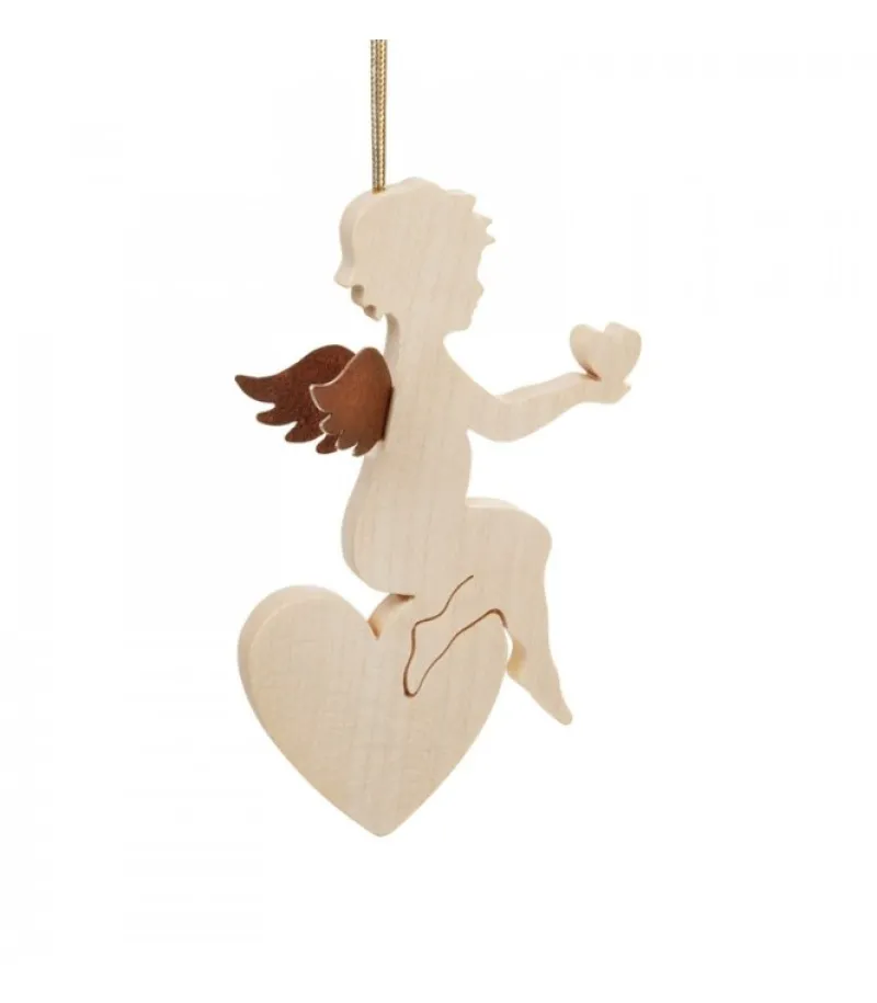 Petit Ange Décoratif A Suspendre, En Bois D’Erable, Assis Sur Un Grand Coeur Avec Ailes En Metal Oxyde Laque.