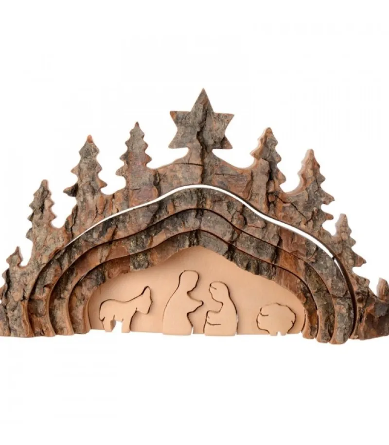 Crèche De Noël En Bois Taillee Dans De L’Ecorce.Nativite En Forme De Grotte.