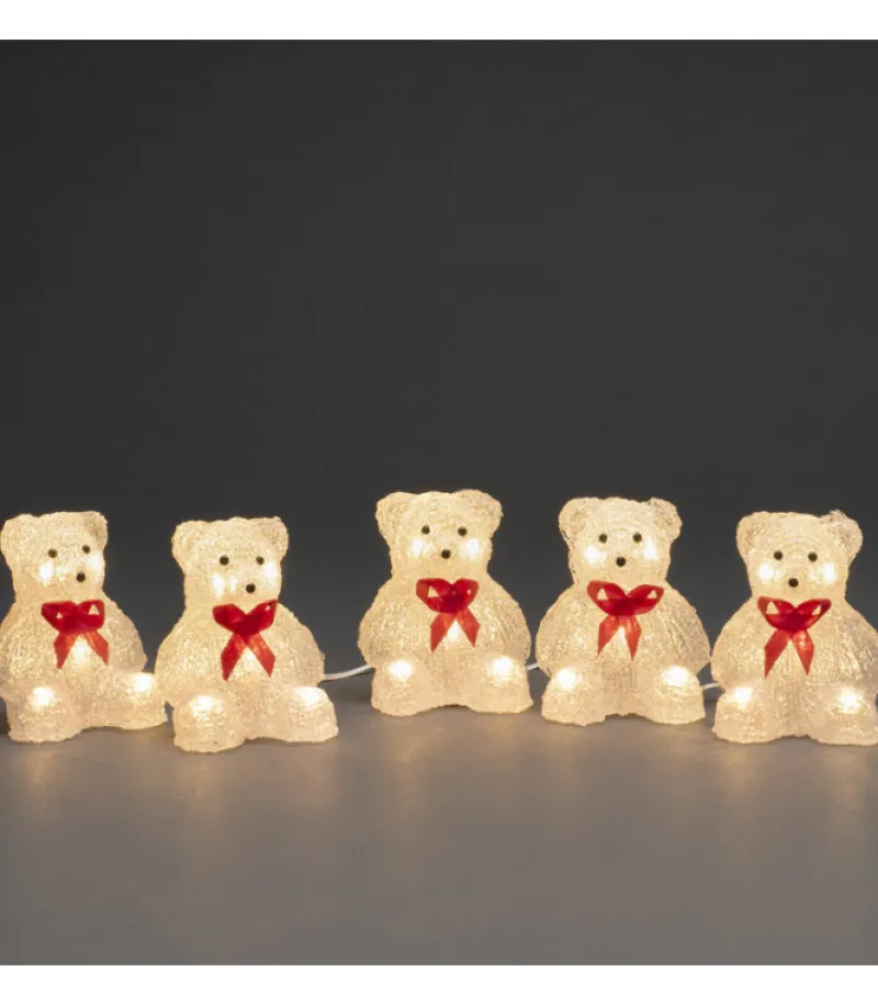 Lots De 5 Petits Oursons Lumineux A Led En Acrylique Avec Ruban Rouge, 40 Diodes Blanc Chaud.