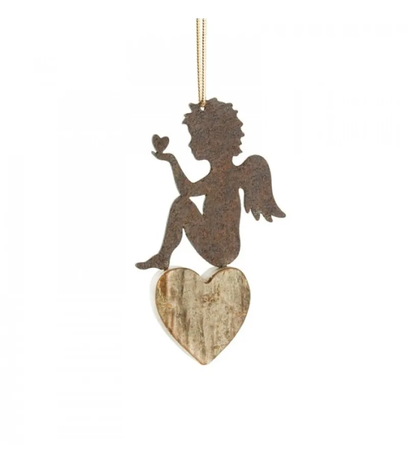 Petit Ange A Suspendre Pour Sapin De Noël Assis Sur Un Coeur En Bois Et Tenant Un Coeur Dans Sa Main.Aspect Patine Meta…