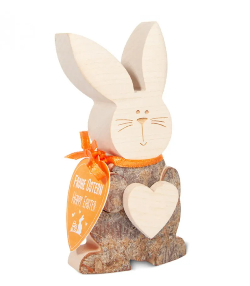 Déco De Paques.Petit Lapin En Bois Avec Un Coeur Sur Le Ventre, 10 Cm.En Bois D’Erable Et Ecorce.
