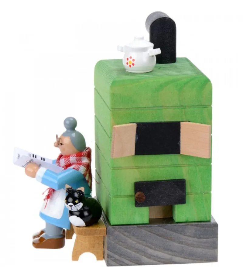 Brule Parfum En Bois Allemand.Poele En Faience Avec Grand-Mere Lisant Le Journal Et Chat.A Utiliser Avec Les Cones D’Enc…