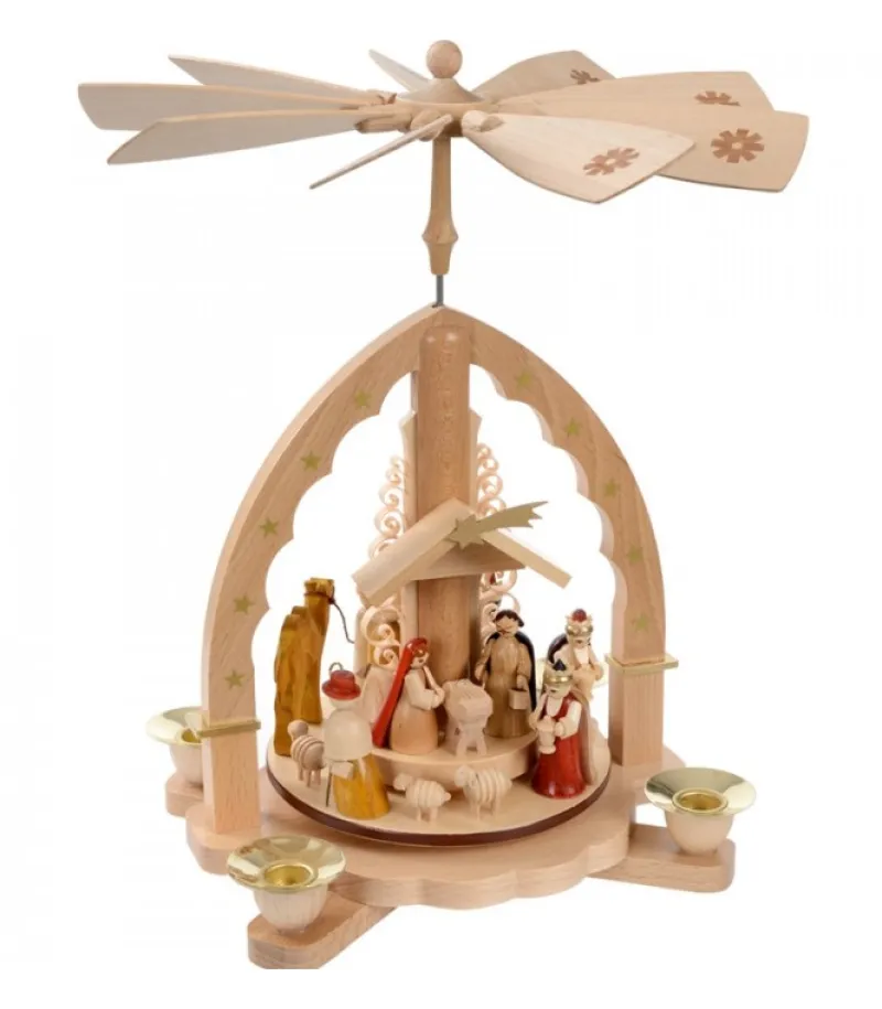 Pyramide En Bois Allemande En Forme D’Arche En Bois Naturel Avec Personnages De La Crèche De Noël Complete.